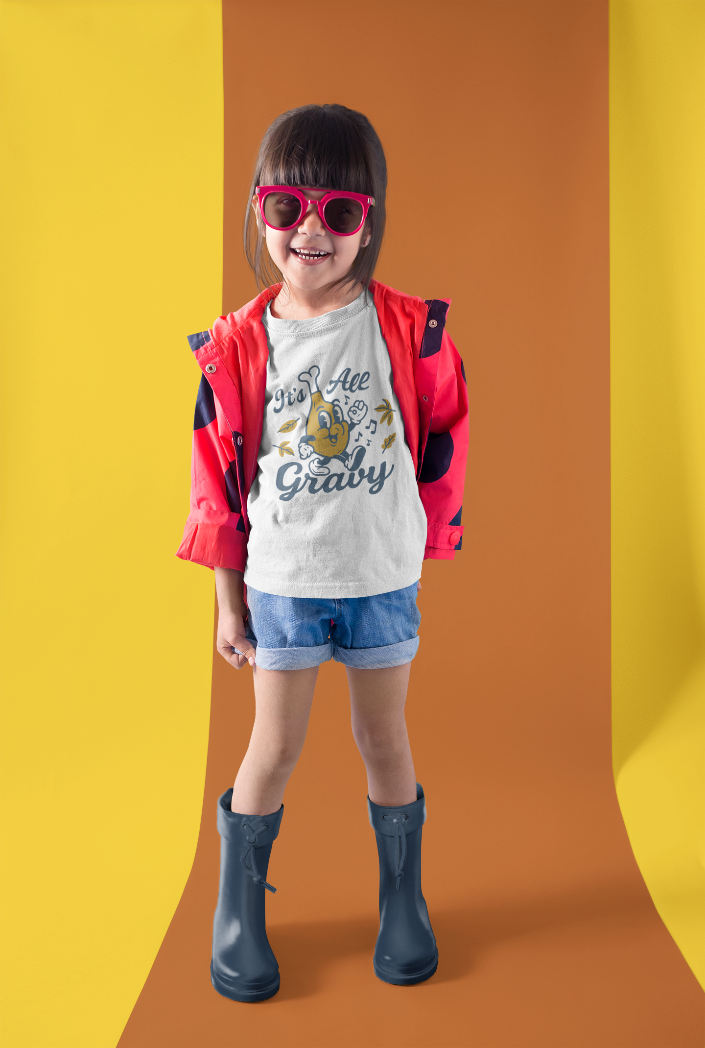 Adorable 'It's All Gravy' toddler shirt with turkey leg design. Soft 100% cotton, perfect for Thanksgiving & fall fun. Sizes 2T-5T. Shop now!