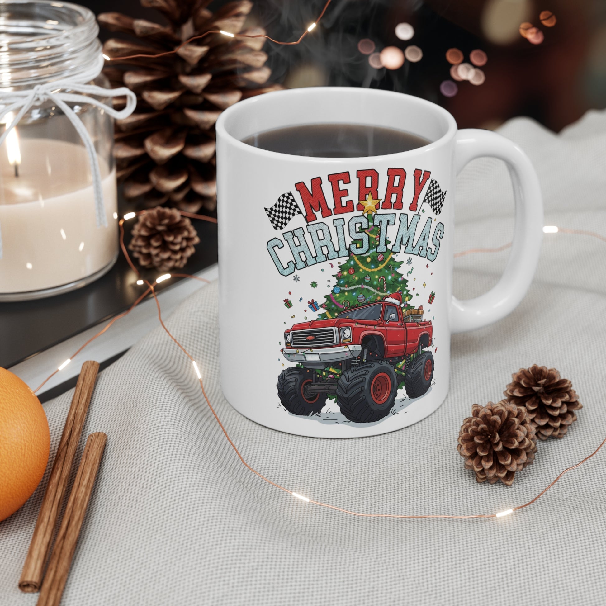 Monster Truck Christmas Mug | 11oz Ceramic Coffee Cup | Holiday Gift for Truck Lovers